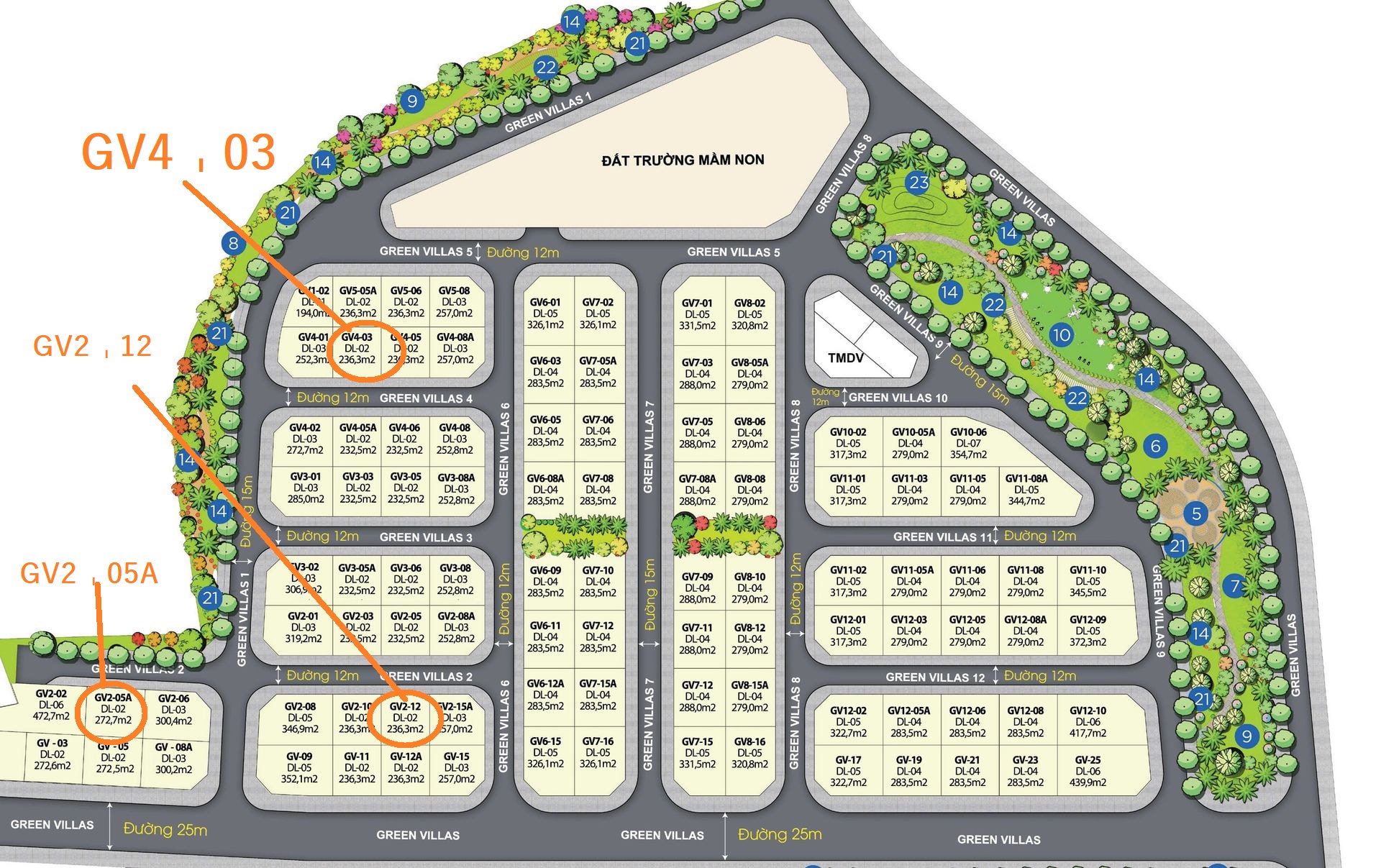 - GV2-05A: Hướng Đông Bắc, diện tích lớn hơn các căn khác tuy nhiên vị trí ko đẹp bằng 2 lô kia